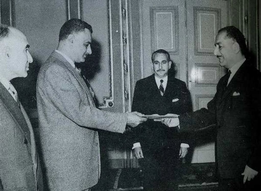 المرحوم عبدالعزيز ملا حسين التركيت رحمه الله خلال تقديم اوراق اعتماده للرئيس جمال عبدالناصر في 20 ديسمبر 1961 كسفير لدولة الكويت في جمهورية مصر العربية