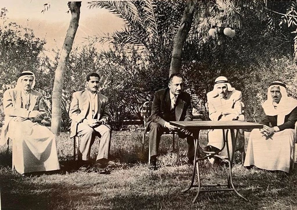 صورة بمزرعة الشيخ صباح الأحمد بمنطقة حولي بتاريخ 24 نوفمبر 1958 وعلى يمينه خالد المسلم وعبدالعزيز حسين التركيت وأحمد السقاف وبدر خالد البدر رحمهم الله.