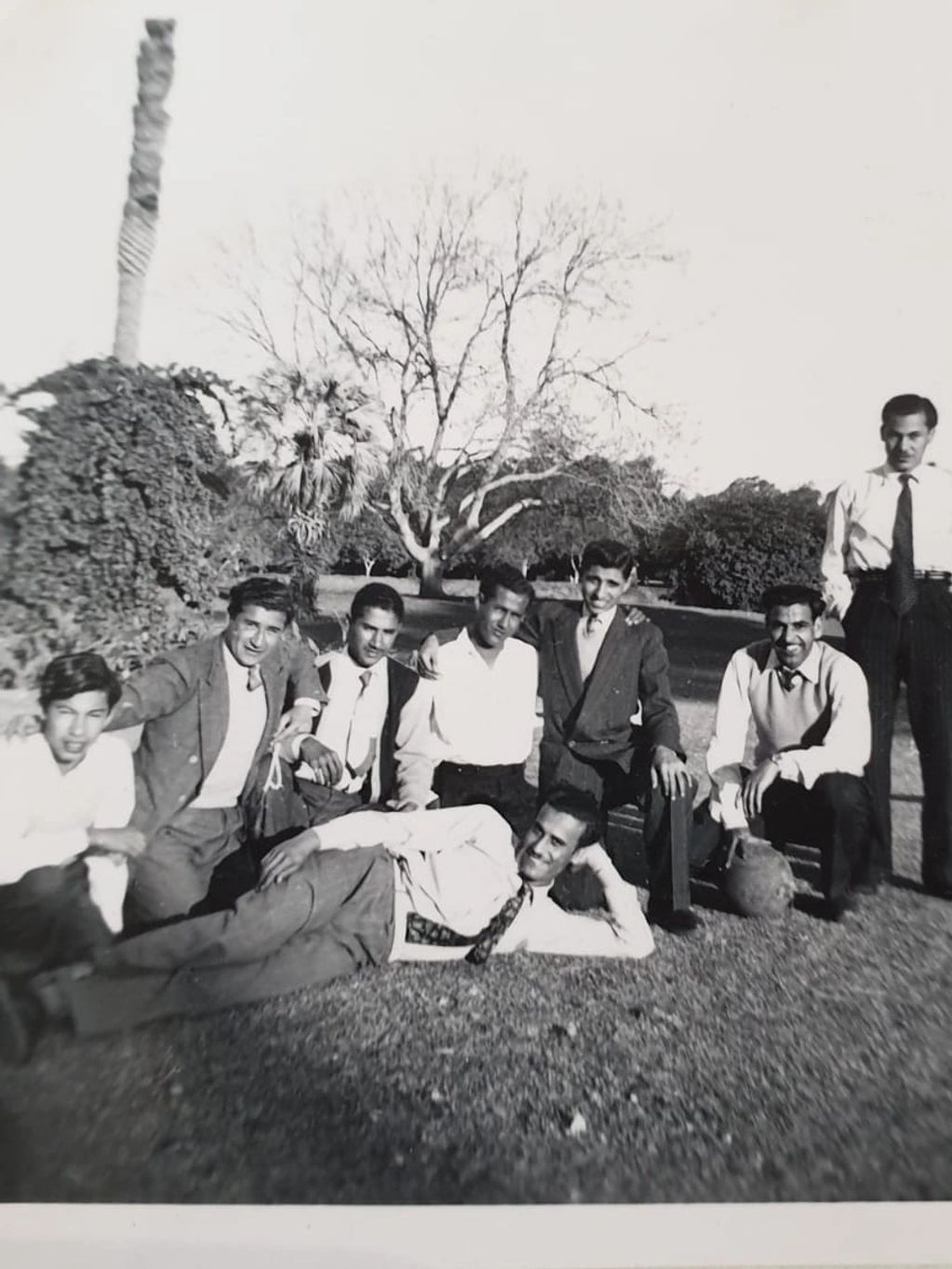 رحلة القناطر الخيرية - مصر - سنة 1951 - محمد الجاسم المطوع، عبداللطيف عبدالوهاب القطامي، سليمان عبدالله اسحق التركيت، عبدالكريم عبدالملك الصالح، أحمد زكريا الأنصاري، سليمان عبداللطيف، عبدالرزاق العبدالرزاق وجلوساً حمد محمد البحر
