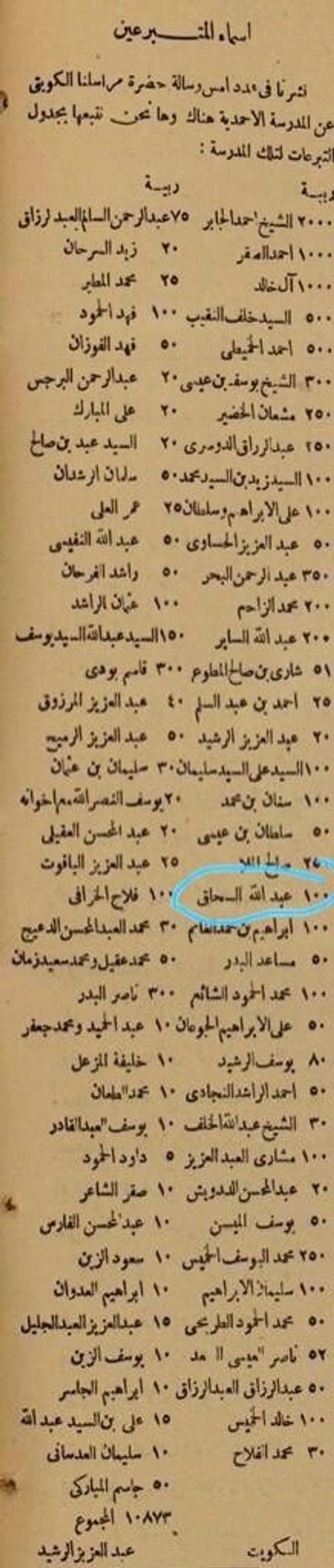 وثيقة تضم أسماء المتبرعين لبناء وتأسيس المدرسة الأحمدية ومن بينهم المرحوم عبدالله اسحق التركيت